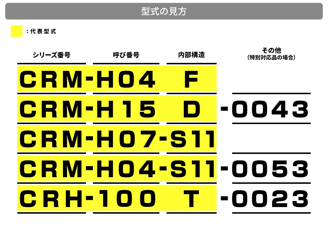 - 例: CRMシリーズ、呼び番号、内部構造の場合