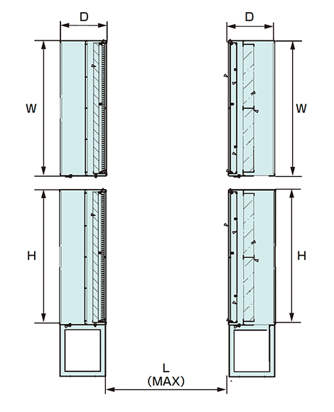 | 型式 | 寸法 (mm) | L (mm) | ダクト径 (φ) | 概略質量 (kg) | 推奨送風機 (プル側) | 参考消費電力 (W) |