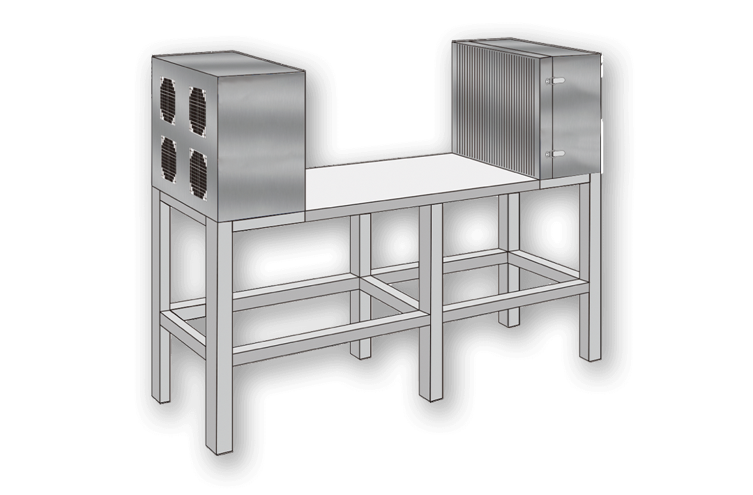フードを左右に配置し水平流を発生する換気システムです。整流された一様流が作業テーブル上を覆うことで有害物質の拡散を抑制します。前後上面開放構造なので様々な場面でご使用いただけます。