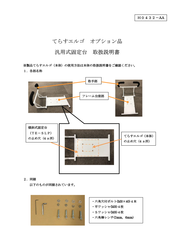 当該製品の修理をご希望される場合、 修理依頼をご記入していただき、 製品と同封して発送お願いいたします。 発送先:〒520-1217 滋賀県高島市安曇川町田中951 SDG滋賀株式会社 てらすエルゴ修理担当 宛 |